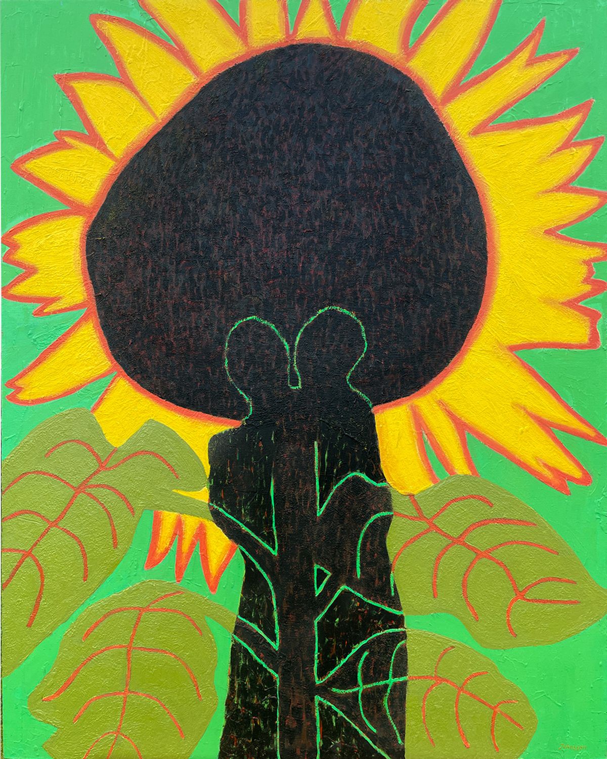 In my painting, two figures stand beneath the sunflower, and their closeness suggests a bond of trust and companionship. As a result, it got transformed into a meeting place.