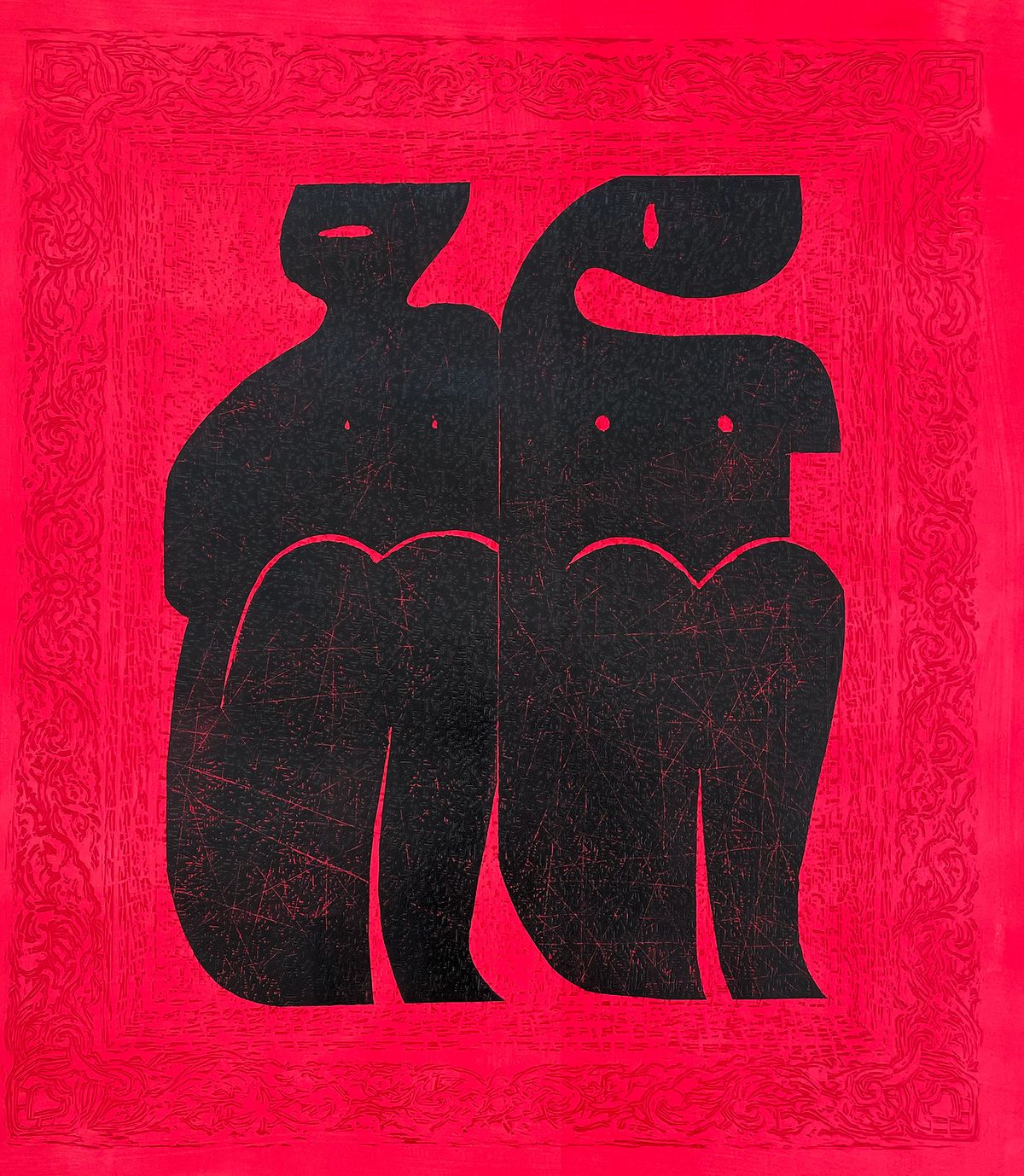 At the top, the two heads diverge from each other, forming what appears to be the beginning of a break in the form. This is a reference to the fact that being in a couple also brings conflicts and difficulties in mutual acceptance. The red background illustrates the space in which this couple finds itself. It is a space of intense feelings and experiences.