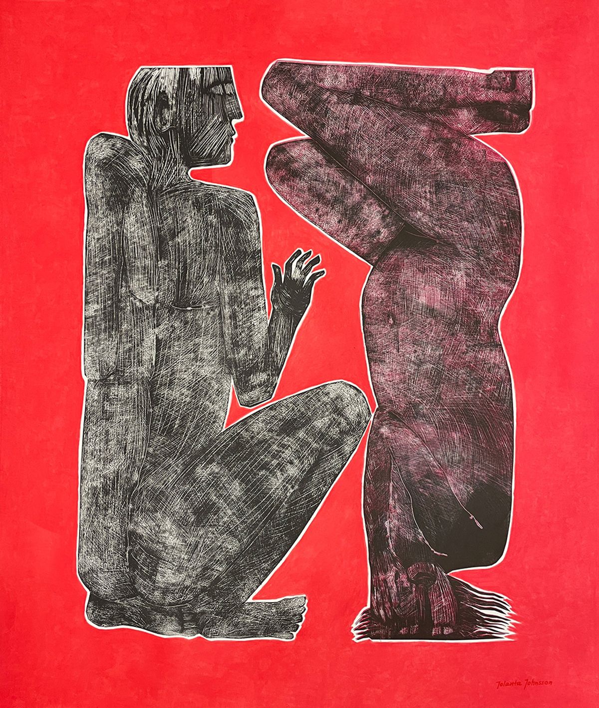 Fine art print with intense red background, therefore, heightens the emotional charge of the piece. Red is a color of extremes, symbolising both love and desire; yet, it also represents danger and hesitation. Furthermore, it envelops the figures, emphasising their presence while deepening the ambiguity of their situation.
