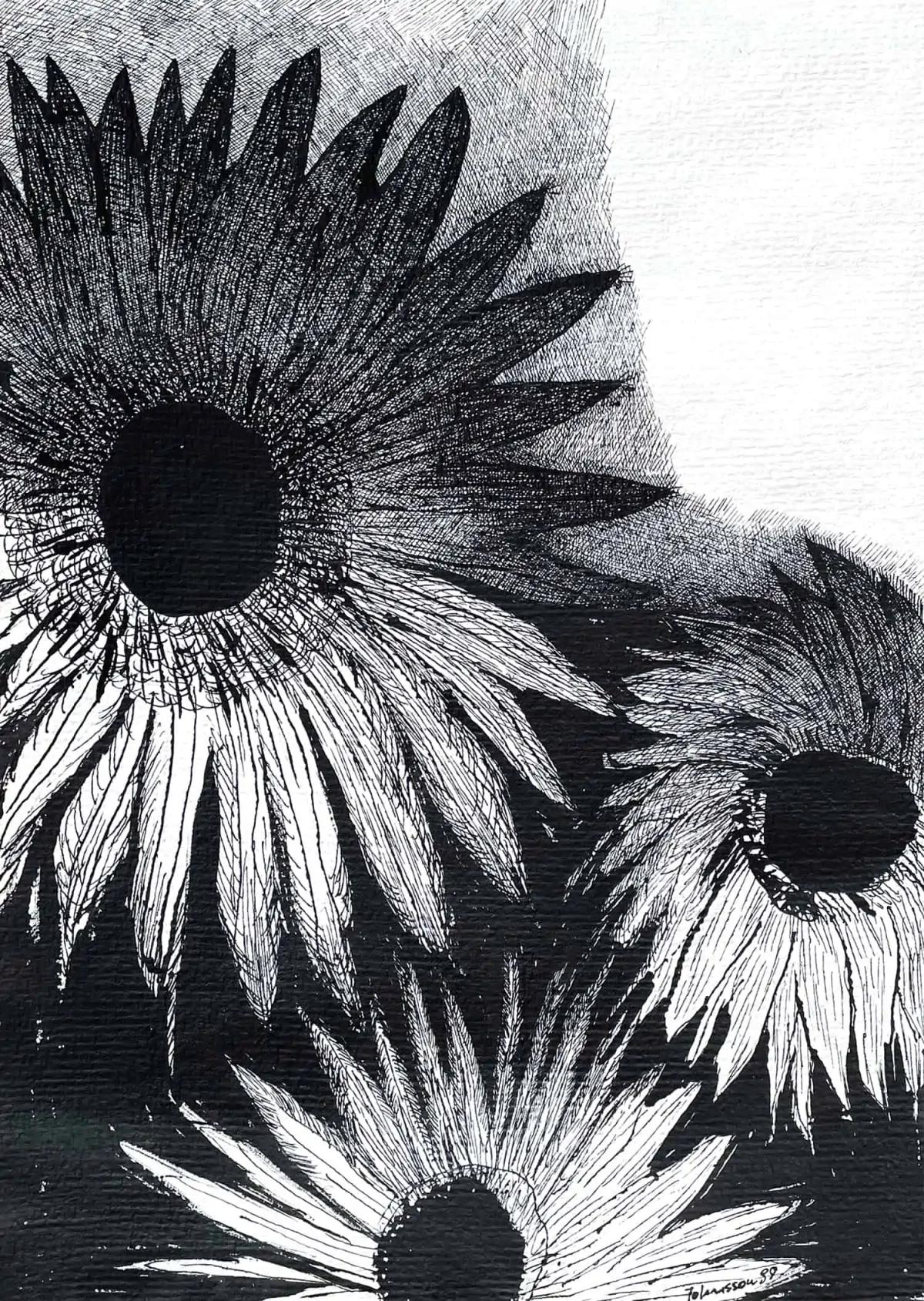 I reach for a pen and ink and draw a picture of the flowers as if I were an architect drawing the structure of a building. I create a sunflower black and white drawing. This time, I am not a colourist, no Claude Monet lilies are present in the drawing. Two starry flowers are looking with their black eye.