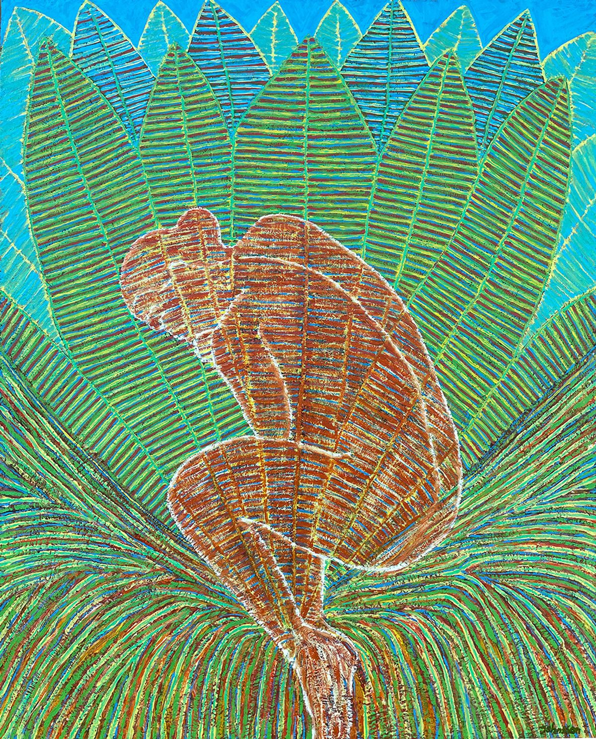 This painting is more than just a visual experience; it is a meditation on the interconnectedness of human existence and the natural world. The juxtaposition of the human form with the growing plant invites contemplation of themes like growth and transformation.