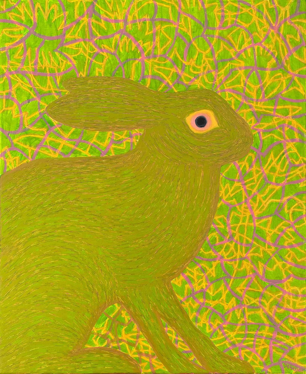 Hare's meadow is its home. The field is his natural habitat, his home. Home is where we want to be, where we feel safe. Does the hare feel safe in the meadow? It will not answer this question for us, we can only guess. Probably his answer would be inconclusive. And from our observations, we can conclude that the meadow is and is not a safe place for the hare. It is home to excellent and varied food and is covered with tall grasses and herbs in which to hide. This is probably the most important rule for the hare to hide from danger. The painting wants to show the hare hidden in the green of the meadow. In its desire to hide, it has even become similar to its surroundings in color. Only his dark sharp eye betrays his presence. The dark spot of the hare's eye is visible against the green background. It looks directly at the viewer. Can the viewer threaten the hare? I hope not. I would like us to look with sympathy at the hare and its attempts to hide. I would like us to say to him: don't pretend, we see you! We know the tricks. Many times we want to hide, to become invisible. Sometimes we close our eyes and think we are not there. We do not go to the meadow. How about following in the footsteps of the hare? Should we look for it on the internet, in the largest online social network for artists and art enthusiasts – Deviantart? Or simply in a hare's meadow?