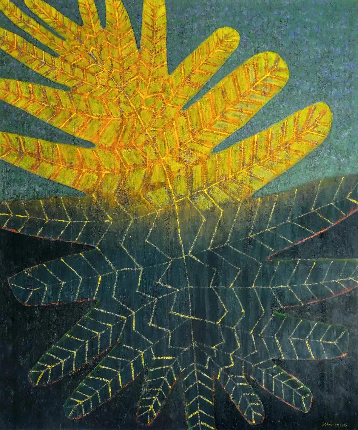 The leaf spreads symmetrically in vertical and horizontal directions, occupying the canvas with deliberate force. Its stem, however, remains hidden, encouraging viewers to question whether this leafly form connects to a tree, another plant, or nothing at all. With no visible anchor, the leaf suggests independence. It appears as a distinct figure, detached from any natural origin, existing purely as a powerful artistic statement.
