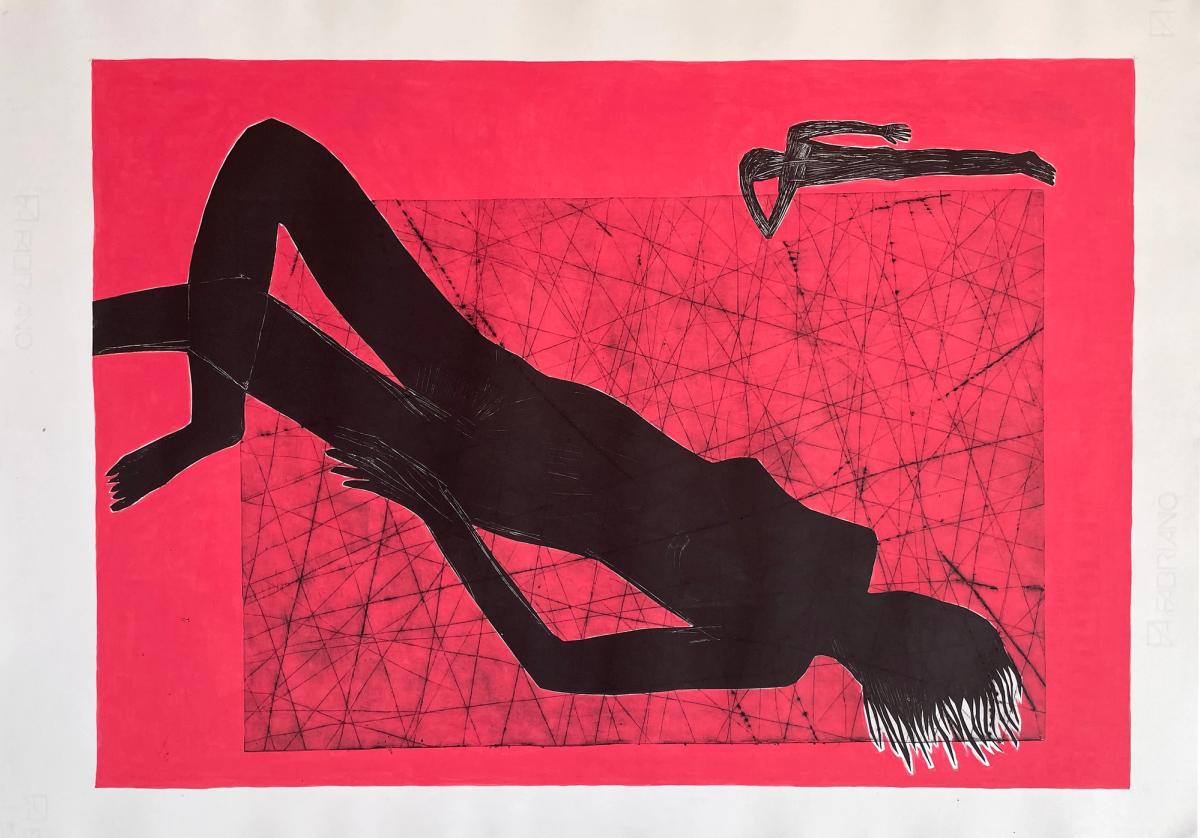 The title Man United with Her carries an irony. In the artwork, the woman stands apart from the man. Furthermore, her presence is magnified by a bold silhouette that dominates the foreground. She is clearly the protagonist, the figure through whom the scene breathes. Yet, it is the man who occupies the title.