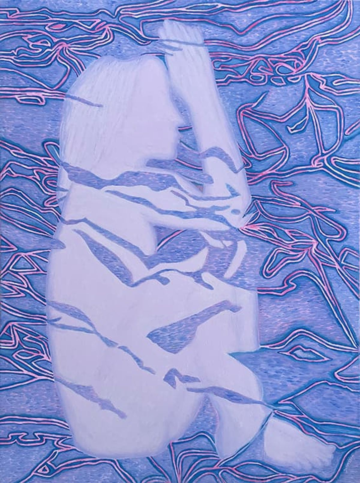 Behind her, an abstract structure in pink and blue adds complexity. The pink color dominates while blue offers contrast, hinting at stability and openness. This composition proves that this hue palette does not simply soften a scene; it also strengthens it. Together, the hues create balance, demonstrating how pink can act as both shield and beacon.