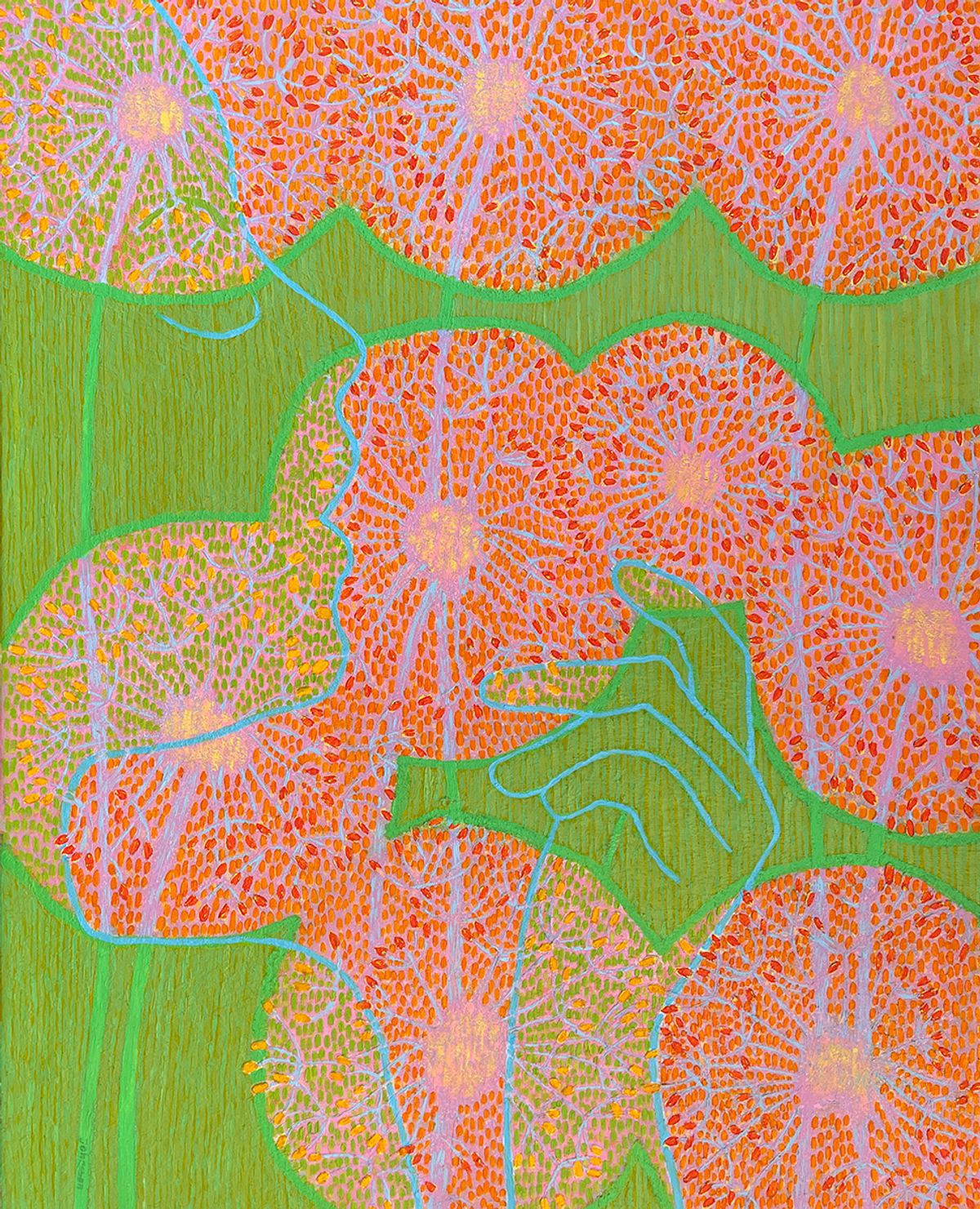 The painting recalls the universal childhood ritual: plucking a dandelion sphere, holding it gently, then blowing with all our might. Watching the seeds scatter in a flurry of white sparks is a timeless delight, a small act that connects generations. Even now, grown-ups cannot resist the playful invitation.
