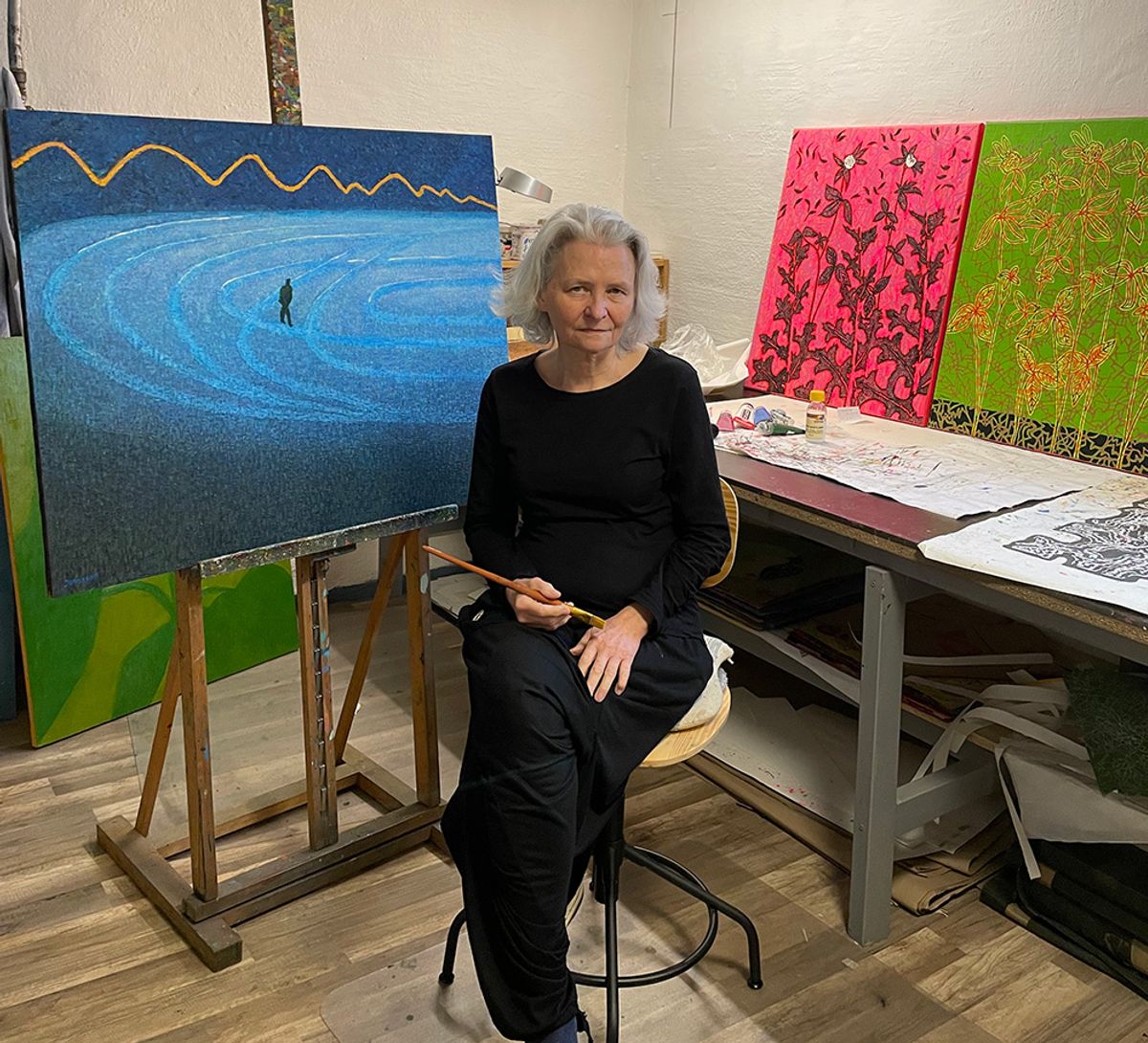 JOlanta Johnsson in her studio is experimenting, searchingfor new forms and colors to expand her imagination. Her workspace becomes a sanctuary where she creates abstract art paintings without limits. She strives to paint with intention and emotion, not just pigment.